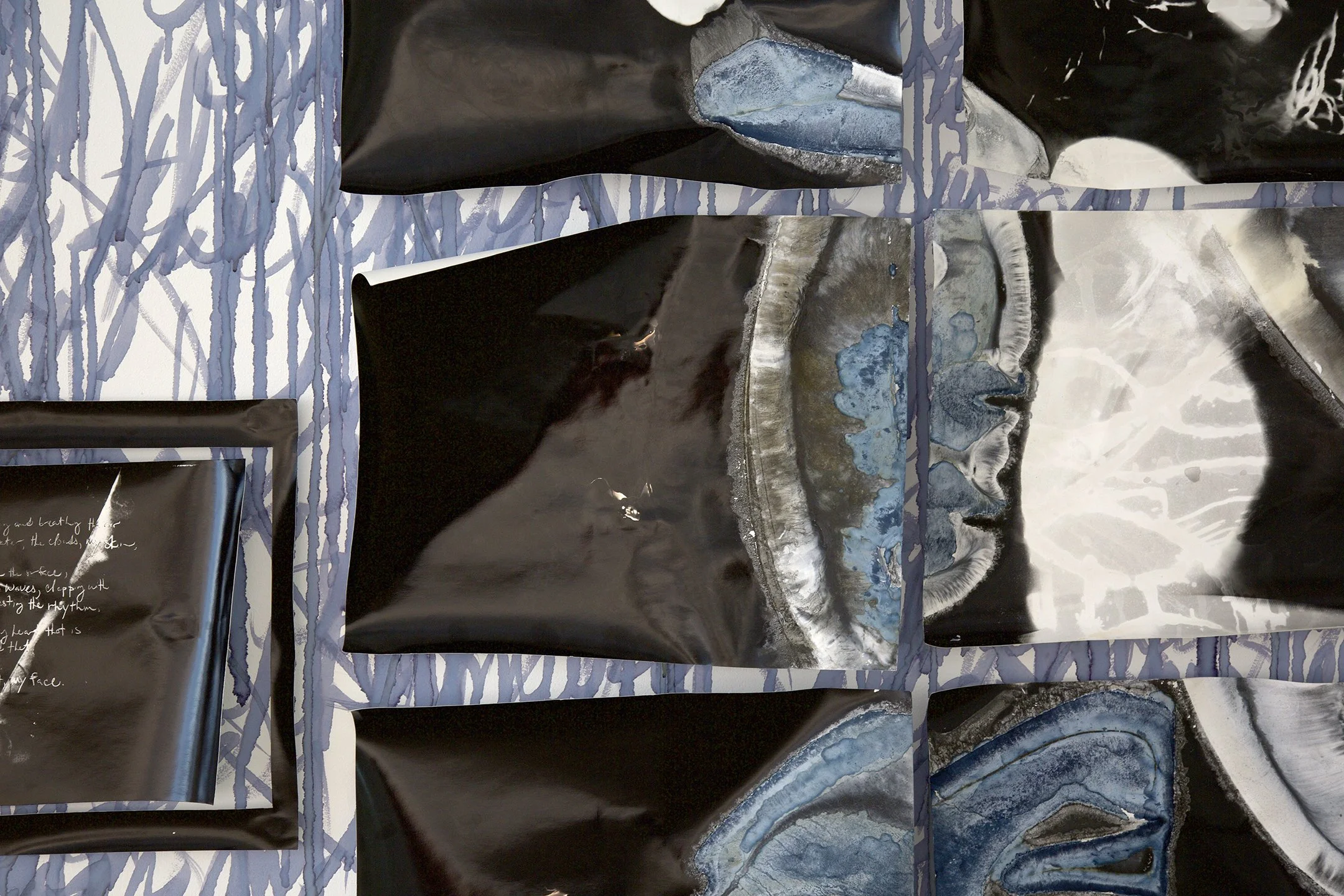Installation detail: “…new love.”Self-portrait cyanotype photograms on canvas, linen and silk fabrics, suspended from ceiling by improvised crochet stitches. Rochester, NY 2025